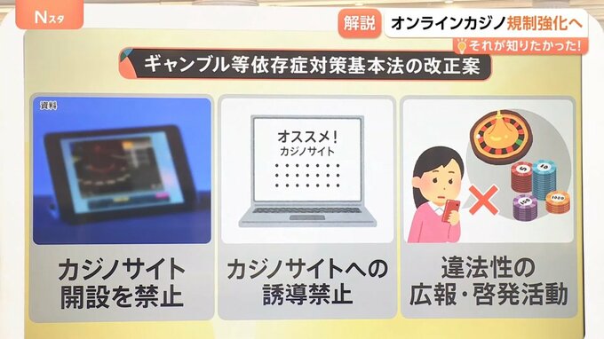 ギャンブル等依存症対策基本法の改正案として、▼カジノサイト開設を禁止、▼カジノサイトへの誘導を禁止、▼違法性の広報・啓発活動などの内容が盛り込まれることになります。