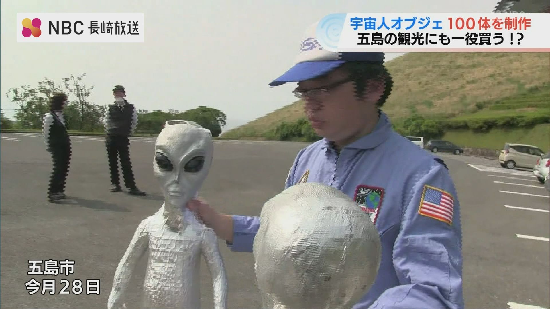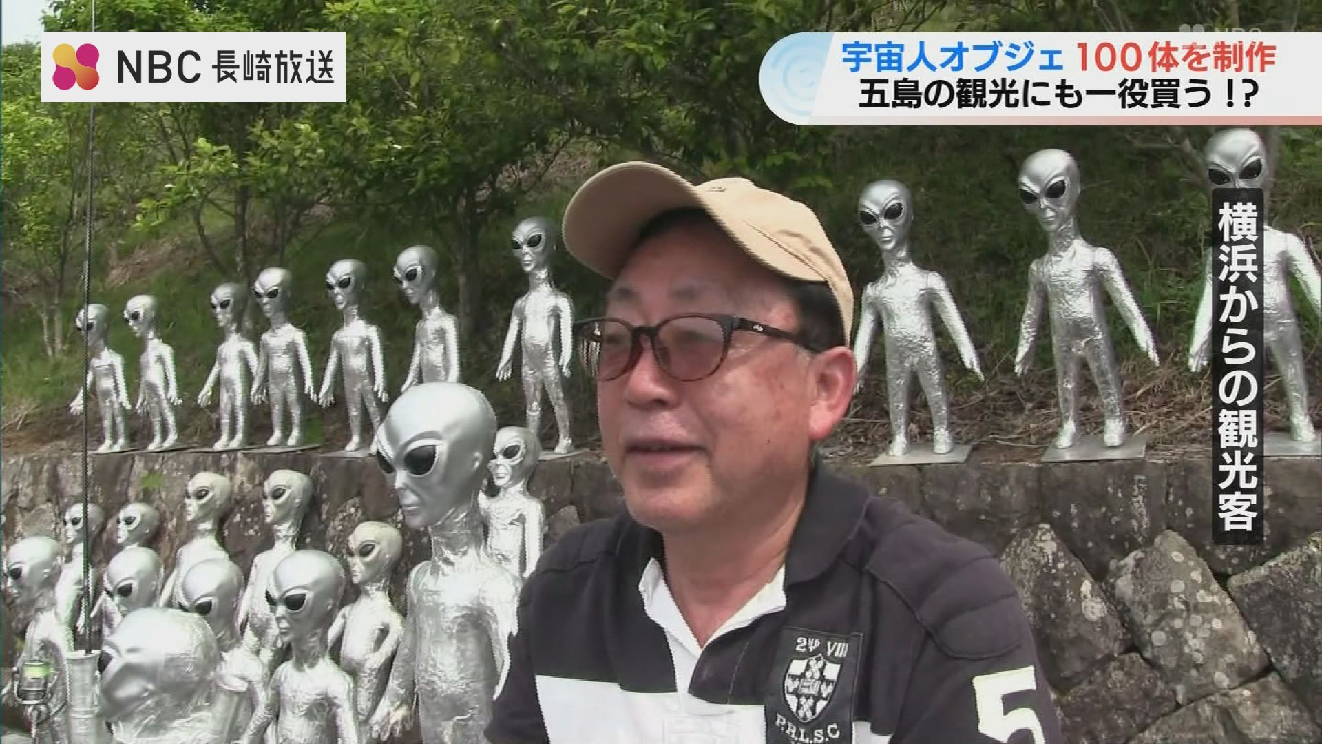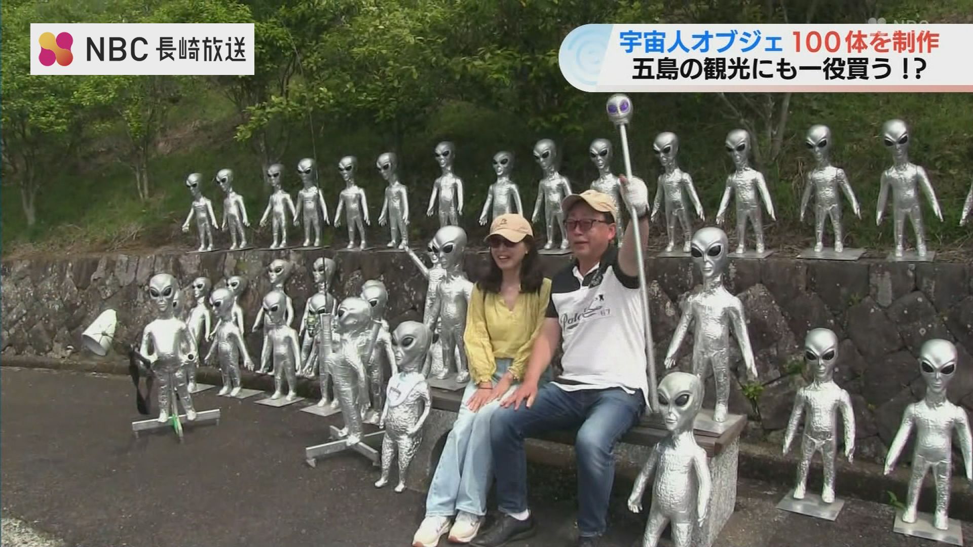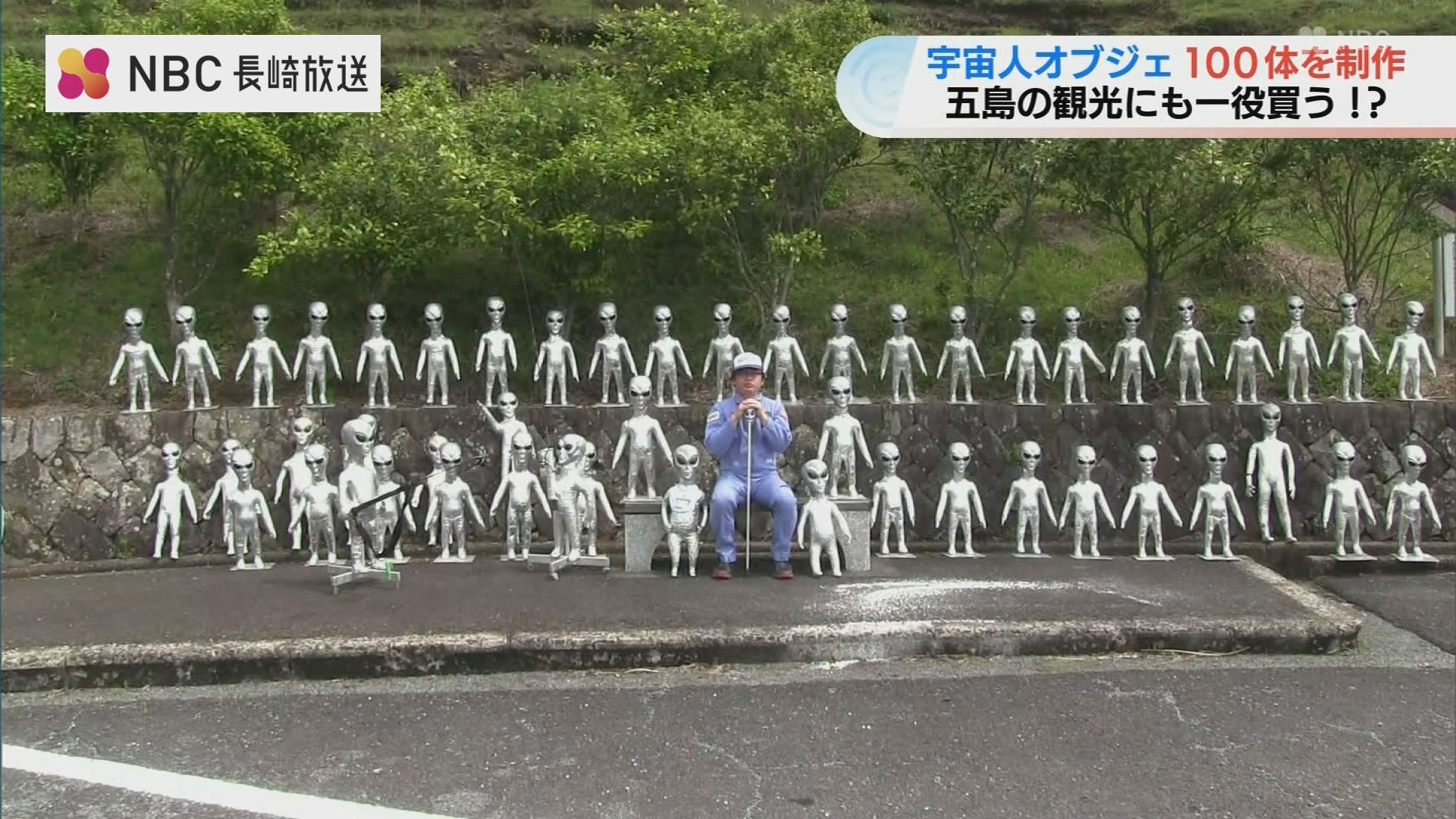 宇宙人のオブジェと一緒に楽しそうに写る長崎県五島市の男性。