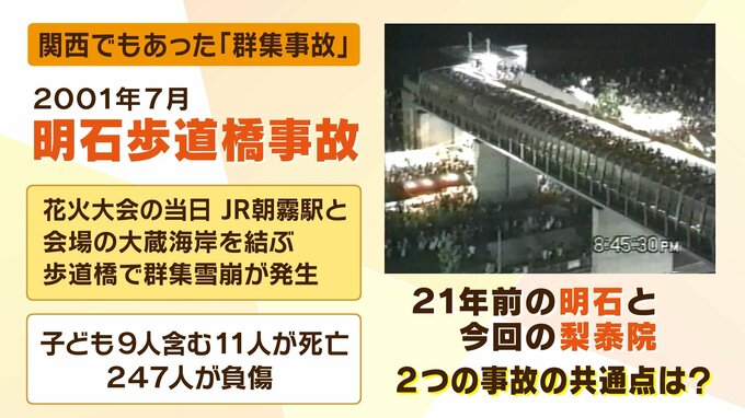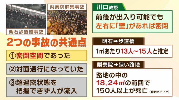 156人もの死者を出した韓国・ソウル梨泰院の転倒事故。過去にも兵庫県明石市の歩道橋で転倒事故が起きています。この2つの事故について、関西大学の川口寿裕教授は「対面通行になっていた」「超過密状態を把握できずに流入が起きた」などと共通点を挙げました。