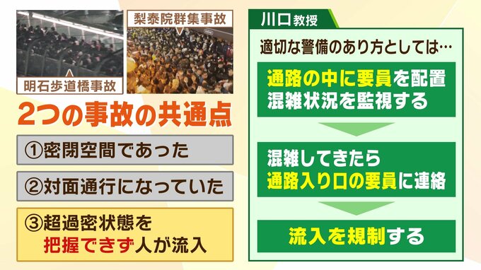 「適切な警備のあり方があるのですが、通路の中に要員を配置、混雑状況を監視、混雑してきたら、通路の入り口の要員に連絡し、流入を規制する警備が必要です。今回の事故でも、大体40mぐらいの長さの通路の真ん中あたりで事故が発生しているということなんですが、1平米あたり13人中5人という密集状態になっているはずなんですけれど、現場から少しずつ離れていくにつれて混雑具合は段々緩和していくんですね。通路の入り口あたりはぱっと見た瞬間、入ってはいけないと危機を感じるほどの状態におそらくなっていなかったんだろうと。だからついつい入ってしまうんですけれども、ゆっくり進んでいくうちに、『ちょっとまずいぞ』ってな感じになり、危険を感じた頃に周りが人だらけで、戻ることもできないという状態に巻き込まれているということになりますね」
