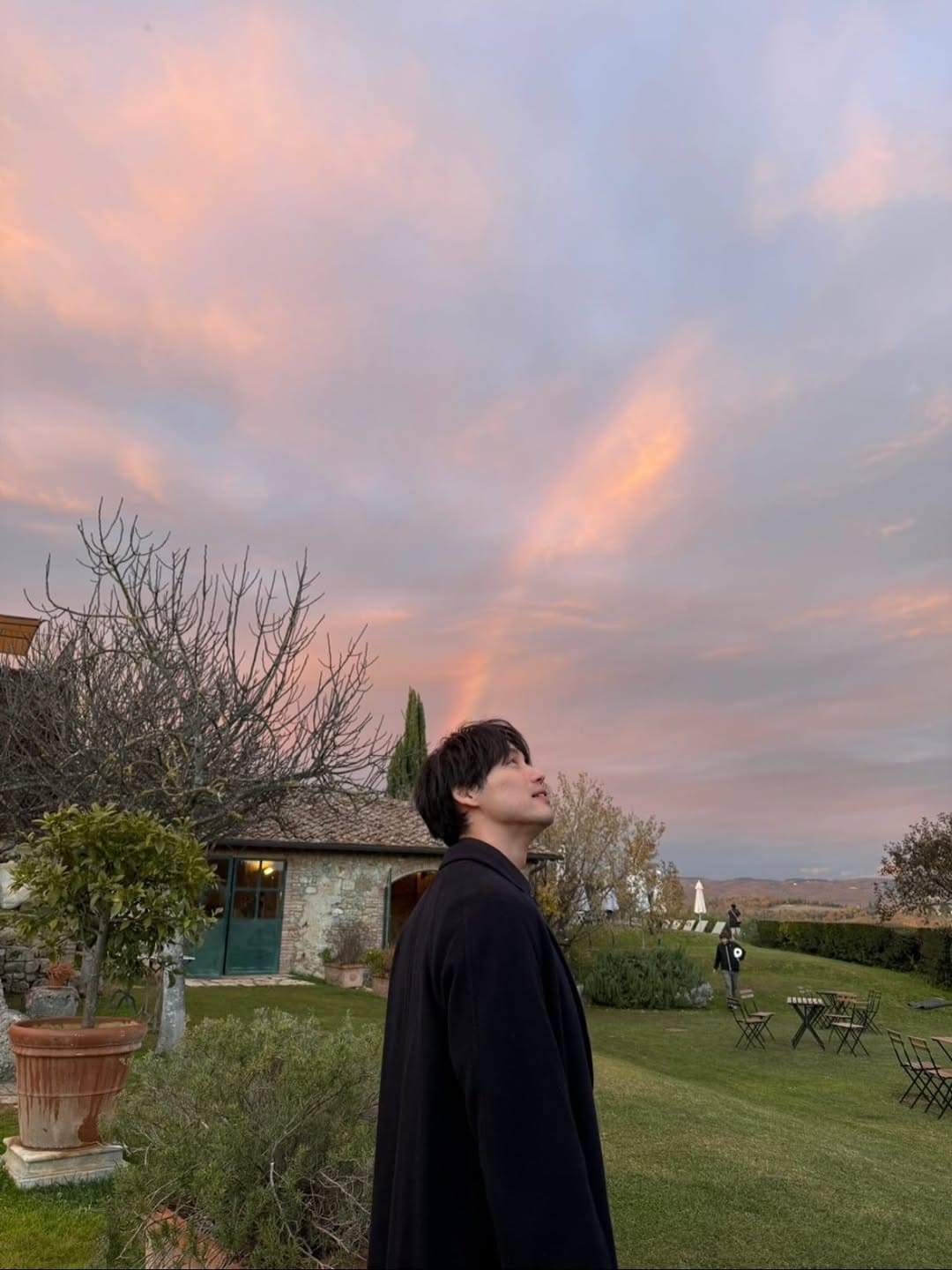 福士さんは、黒いシャツに黒いコートを合わせた姿で、丘の上のカフェらしき場所で撮影された写真を投稿。福士さんの前途を祝うかのように、背後の空には虹が立ち上っていて、福士さんは笑顔を見せています。