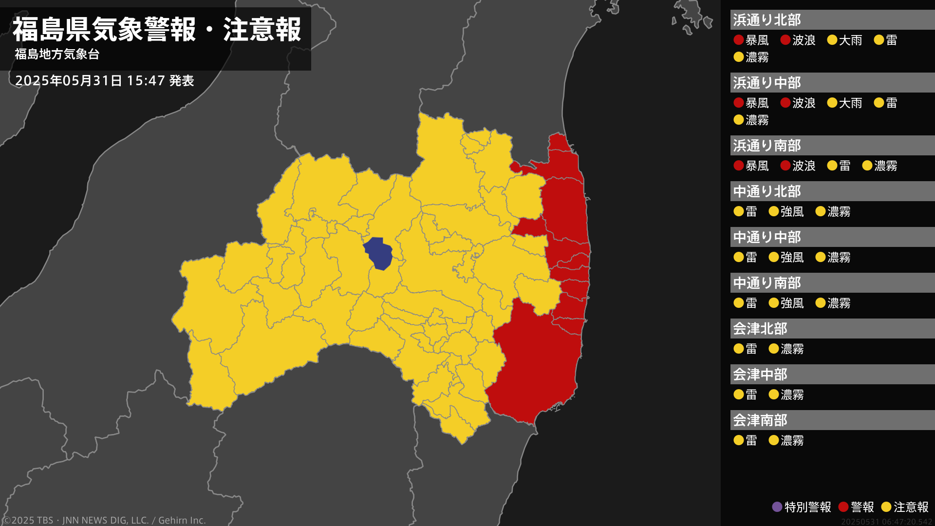 気象台は、午後3時47分に、波浪警報をいわき市、相馬市、南相馬市、広野町、楢葉町、富岡町、大熊町、双葉町、浪江町、新地町に発表しました。