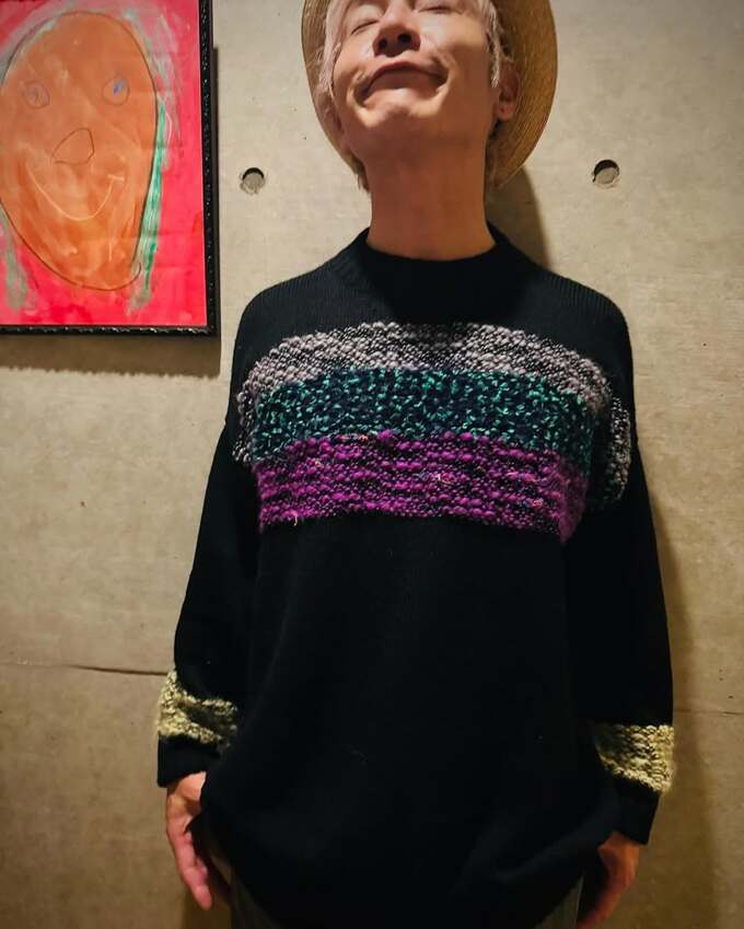 つるのさんは「当時スタイリストだった奥さんに"僕の人生をスタイリングしてください"とプロポーズしてドン滑ってから約22年。」と振り返りました。そんなつるのさんが着ているのは、黒を基調に胸に白・緑・紫を、袖口に黄色を編み込んだセーター。