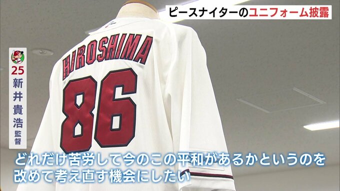 今年のピースナイターで着用するユニフォームが31日、披露され、新井監督が平和への思いを語りました。