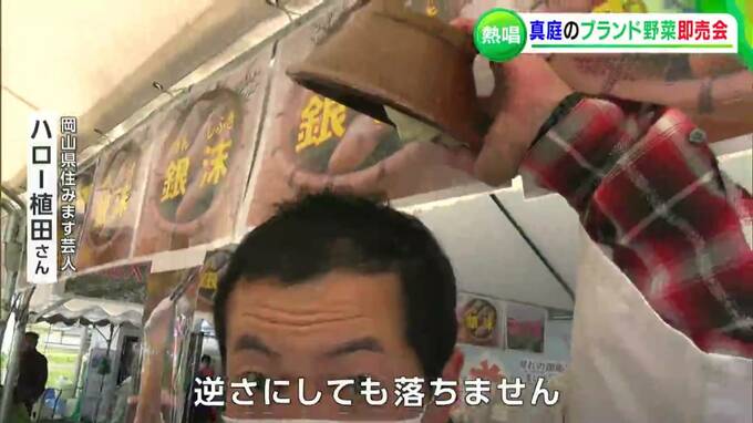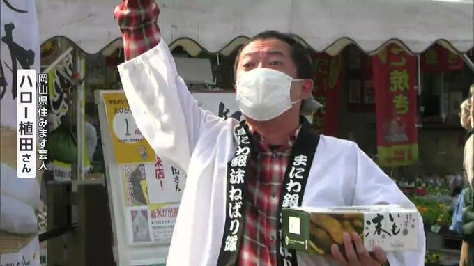 旬を迎えた、ともに真庭市のブランド野菜「蒜山大根」とやまのいも・「銀沫(ぎんしぶき)」の即売会が総社市で開かれました。ロックバンド・B'zのものまねを得意とするお笑いタレントも訪れ会場を盛り上げました。