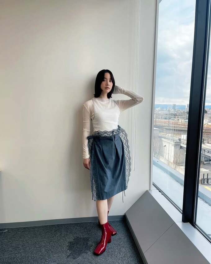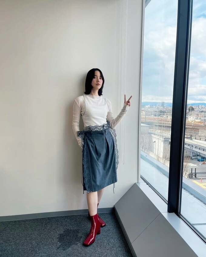 投稿された画像では、白い長袖シャツと青いスカートという爽やかなコーディネートに、アクセントとなる赤いブーツを合わせた、のんさんの姿が見て取れます。リラックスした表情が印象的で、窓の外に広がる青空と街並み、鉄道の風景が背景となっています。明るい光に包まれたこのショットからは、のんさんの自然体の魅力が伝わってきます。