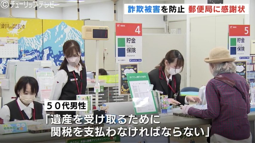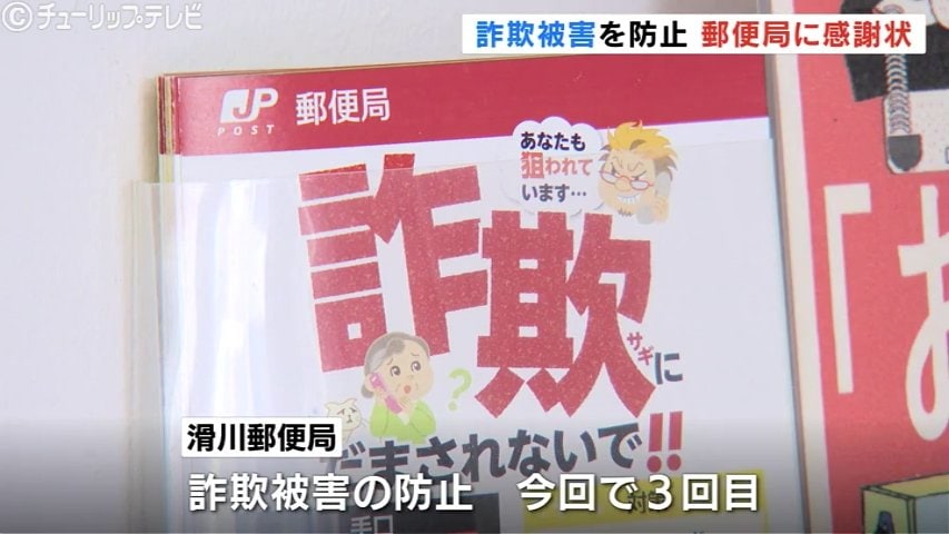 滑川郵便局が詐欺被害を防止したのは今回で3回目です。