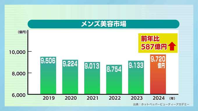 ホットペッパービューティの調査によると、メンズ美容市場は、2024年、前の年から587億円アップの9720億円と飛躍的に拡大しています。