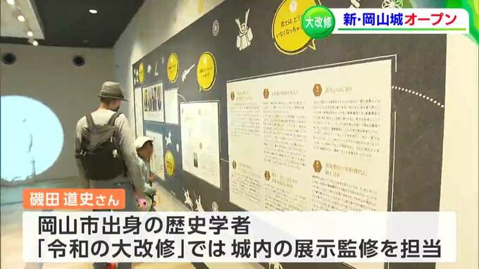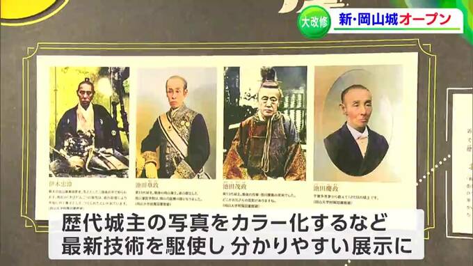 岡山市出身の歴史学者、磯田道史さんが監修を担当し、歴代城主の写真をカラー化したり、プロジェクションマッピングを駆使したりするなど最新技術を活用しました。