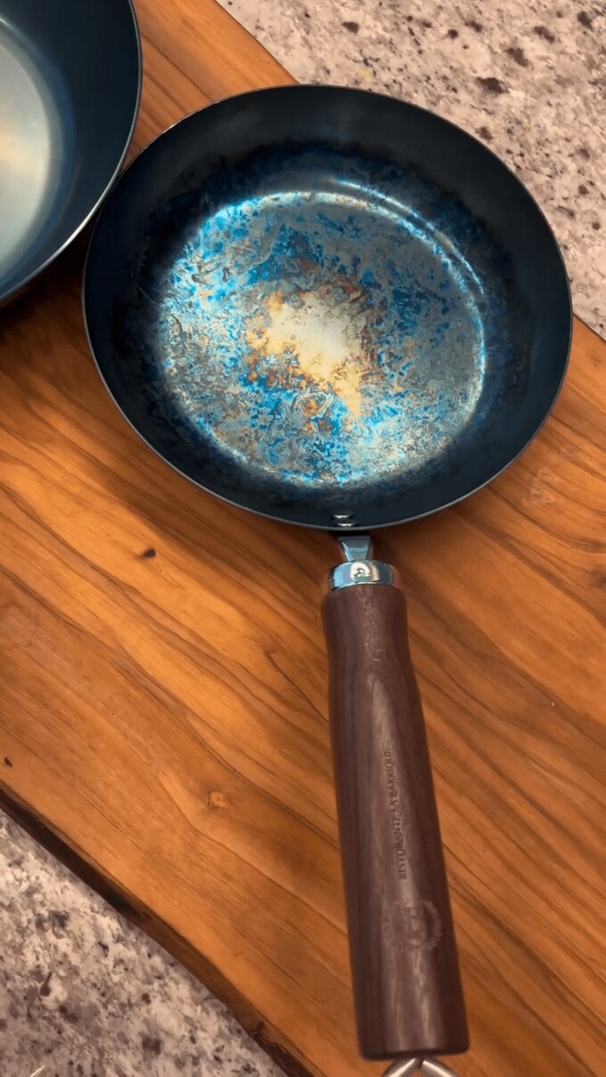 続けて「鉄のフライパンです!油の加減や温度、自分の調理のタイミングをフライパンと一緒に育てていく感じです。」「育て放棄にならないかどうか、笑」と、綴りました。
