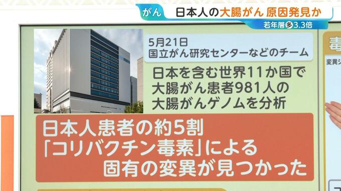 国立がん研究センターなどのチームが、日本を含む世界11か国で大腸がん患者981人の大腸がんゲノムを分析したところ、日本人患者の約5割に「コリバクチン毒素」による変異が見つかったというものです。