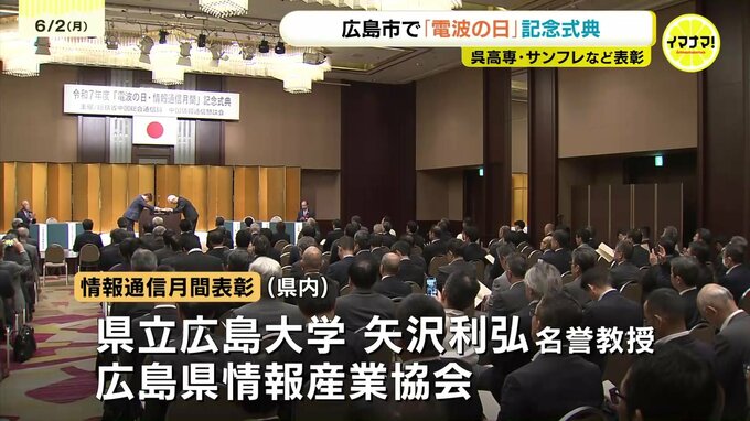 電波の日は、1950年に電波の利用が国民に開放されたことを記念して定められました。式典には、中国地方で通信事業に関わる企業や団体からおよそ200人が出席。電波利用や情報通信の発展に貢献した3人と11の団体が表彰されました。
