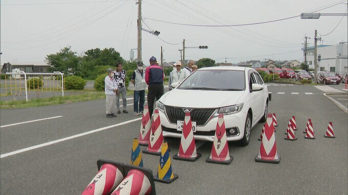 参加者は高齢者の事故の現状について講習を受けたあと、実際に車に乗り込みカラーコーンを使って運転席から死角になる部分を確認しました。