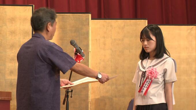 式典では、電波の利用や情報通信の発展に貢献した個人や団体の表彰が行われ、このうち、「闇バイト職に就けても前科つく」という標語を考えた寄宮中学校3年生の仲眞佳梨乃さんには沖縄総合通信事務所長賞が贈られました。