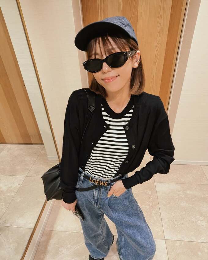 また、室内でポーズをとり、モダンなインテリアを背景に全身コーディネートを披露しています。黒のキャップとサングラスという小物使いでカジュアルな印象を強調しながらも、ストライプのシャツに黒のカーディガンを重ね、デニムパンツを合わせたスタイリングを見せ、「デニムコーデは運動会コーデ」と紹介しています。