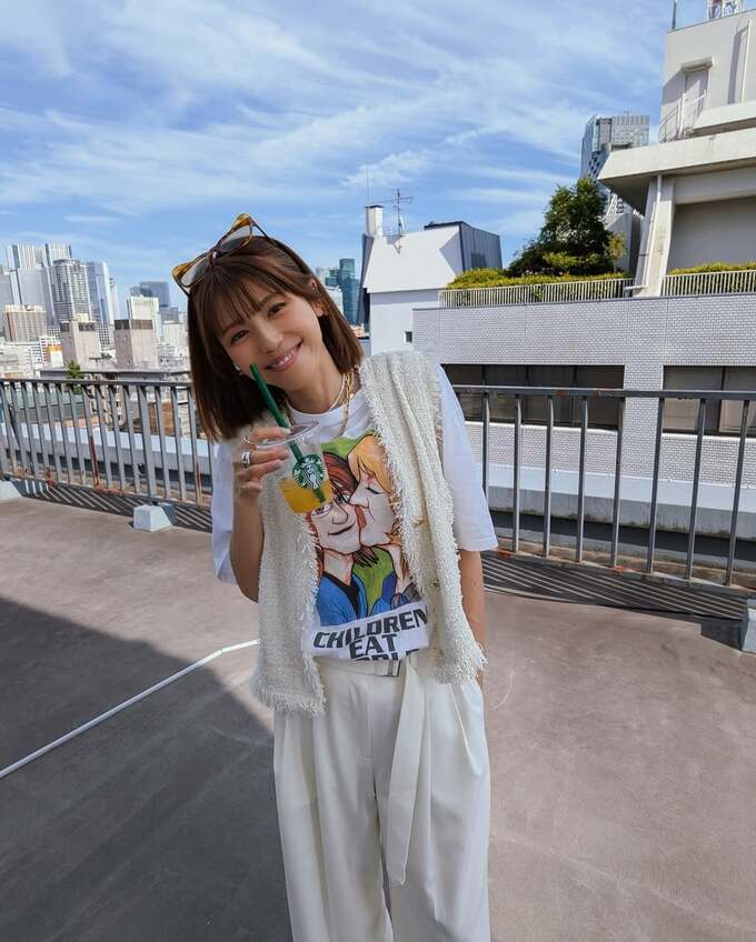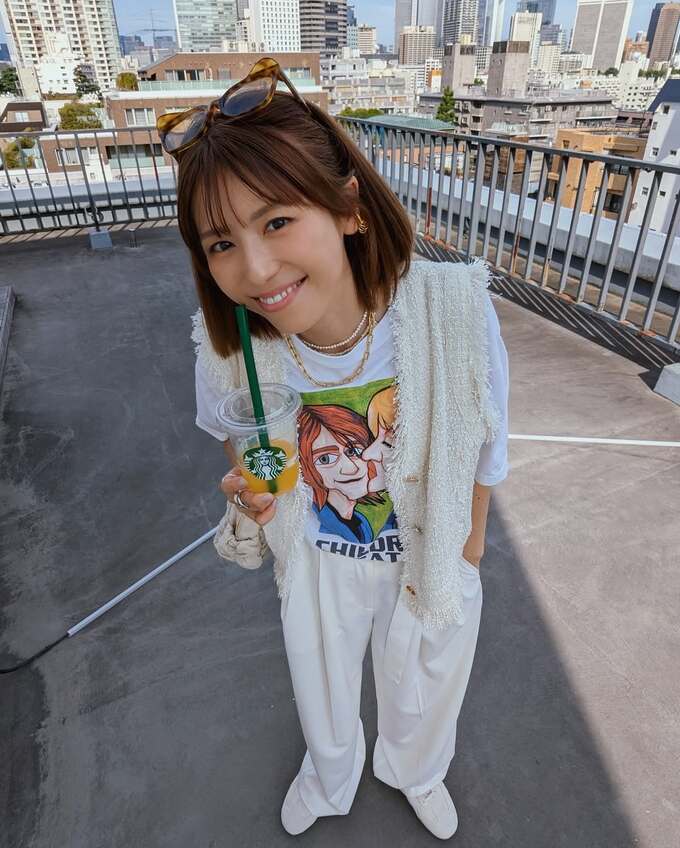 別の写真では、高層ビルを背景に白いパンツとベスト、キャラクターがプリントされたTシャツという組み合わせで登場。手には冷たいドリンクを持ち、サングラスを頭にかけた爽やかなスタイルで、晴れた青空の下で笑顔を見せています。
