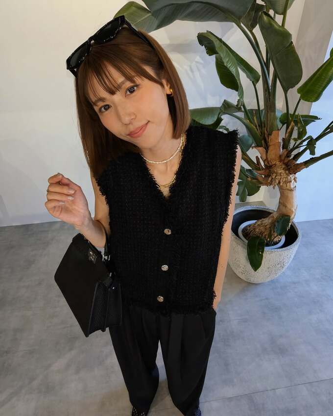 投稿された写真には、黒のノースリーブベストに黒のパンツを合わせたシックなモノトーンコーデでは、パールのネックレスと金色のイヤリングでアクセントを付け、若槻さんが笑みを浮かべています。