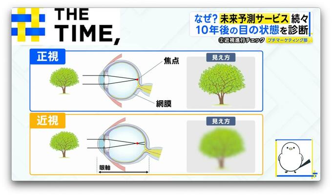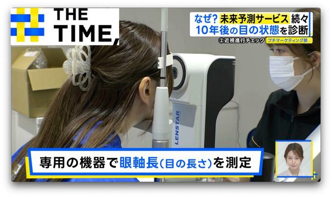 『渋谷アイケアクリニック』(東京・渋谷区)で行う「近視進行予測グラフ」(5000円)では、専用の機器で「眼軸(がんじく)」=「眼球の奥行き」を測定。