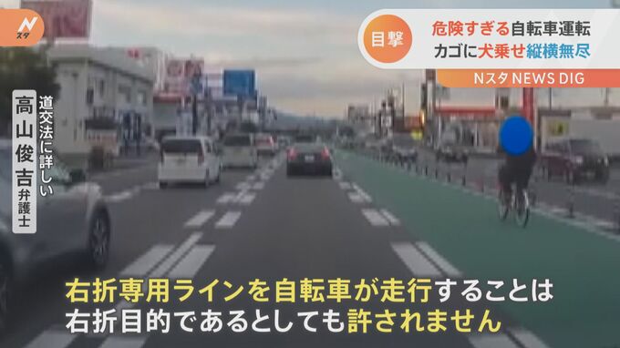 「右折専用ラインを自転車が走行することは、右折目的であるとしても許されません」