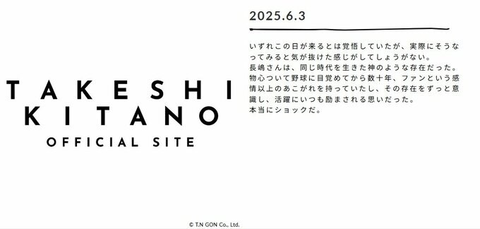 長嶋茂雄終身名誉監督の訃報を受け、北野武さんが、自身の公式サイトで追悼のコメントを発表しました。