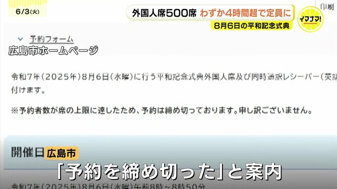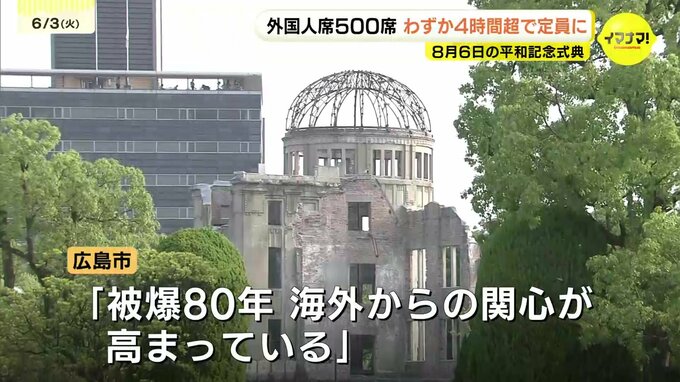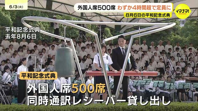 8月6日の平和記念式典で、外国人席の予約申し込みが3日から始まり、わずか4時間あまりで500席すべての予約が埋まり、定員に達しました。