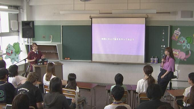 子どもの歯磨きは、保護者による「仕上げ磨き」が必要で、菊地先生が“1つ目は、奥歯の噛み合わせ部分。2つ目は、歯と歯の間。3つ目は、歯の裏側や、付け根”と説明。藤本さんは“分かりやすい。すぐ実践できそう!”と、真剣な眼差しで、授業を聞き入っていました。