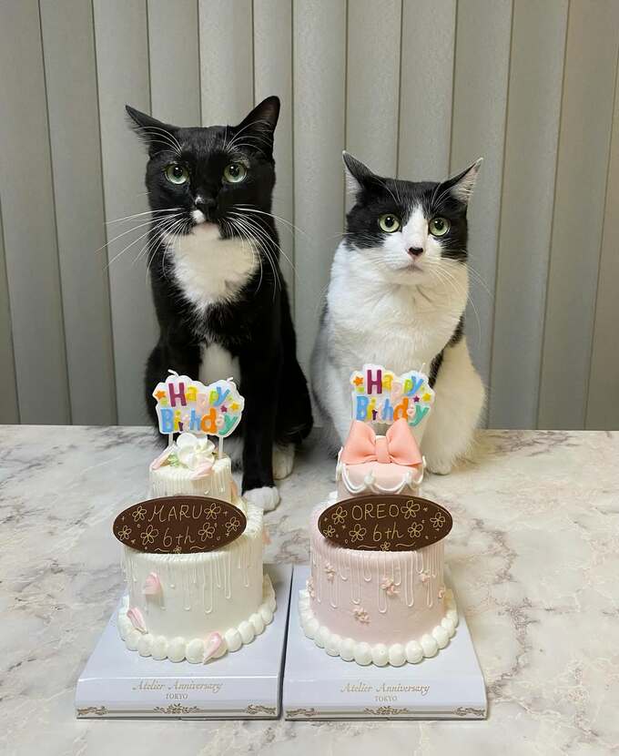 藤さんは2頭の写真を投稿。黒が多くて胸腹が白いタキシード柄の「マル」と、頭が黒くて白い綺麗な富士額になっている “ハチワレ” の「オレオ」。2頭が並んで正座している前には、それぞれ「MARU 6th」「Oreo 6th」と書かれたプレートと「Happy Birthday」のモールが立てられたバースデーケーキが並んでいます。