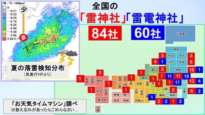 農作物の成長に影響のある夏の雷を見てみると、落雷の分布図と「雷神社」「雷電神社」の分布が重なるような状況になっているのがわかります。
