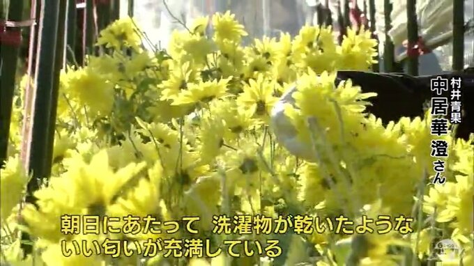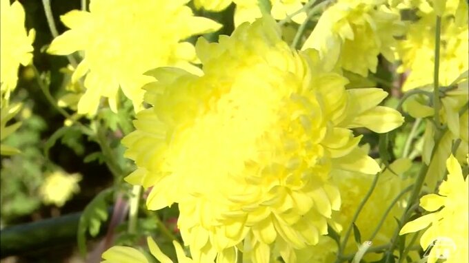 秋の日差しを受けて鮮やかに映える大輪の黄色い花々。南部町の山あいにある村井青果の畑ではいま、特産の食用菊「阿房宮(あぼうきょう)」の収穫が最んに行われています。