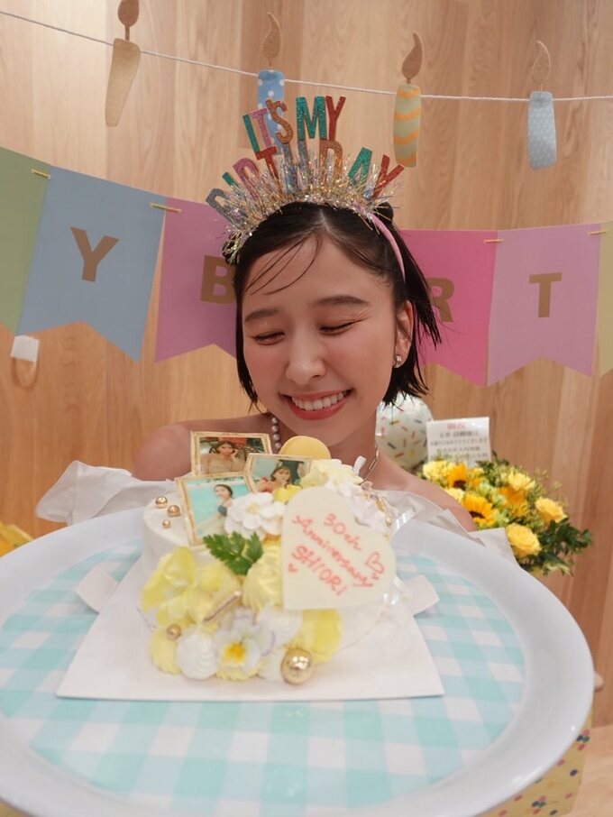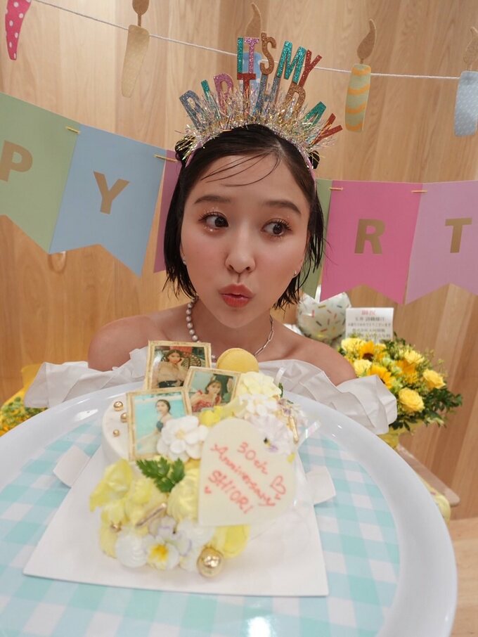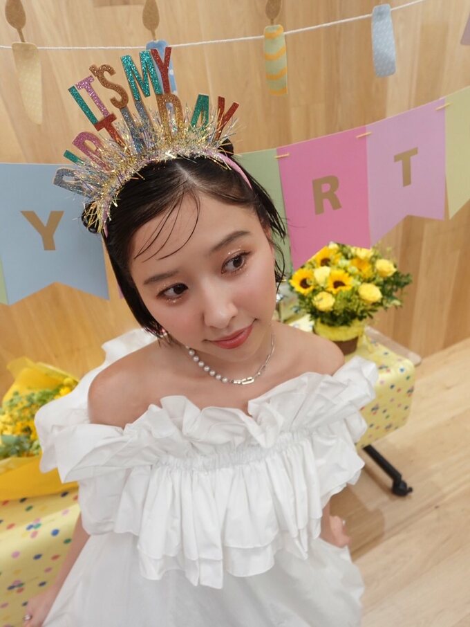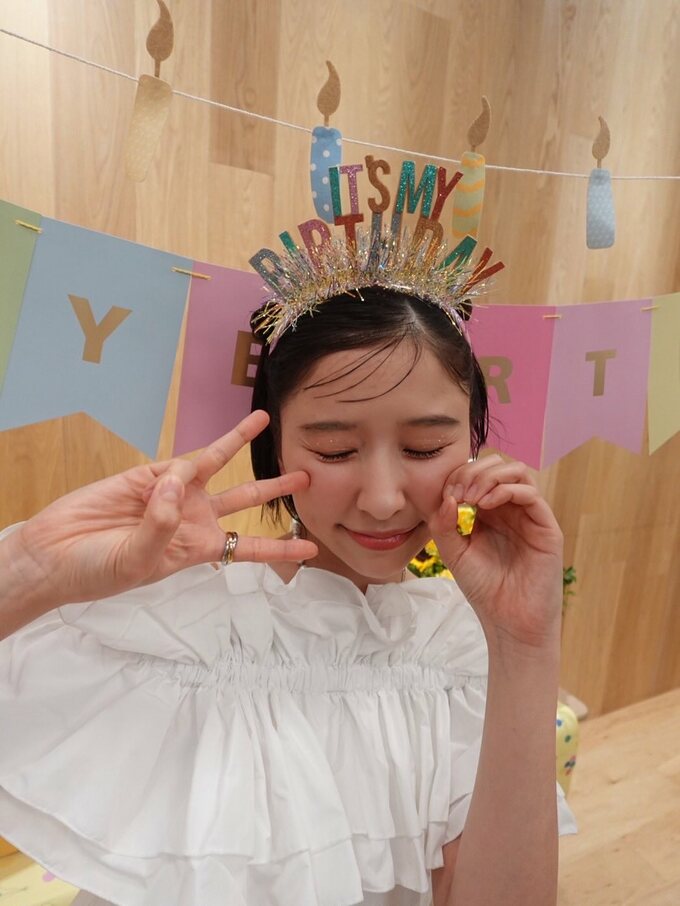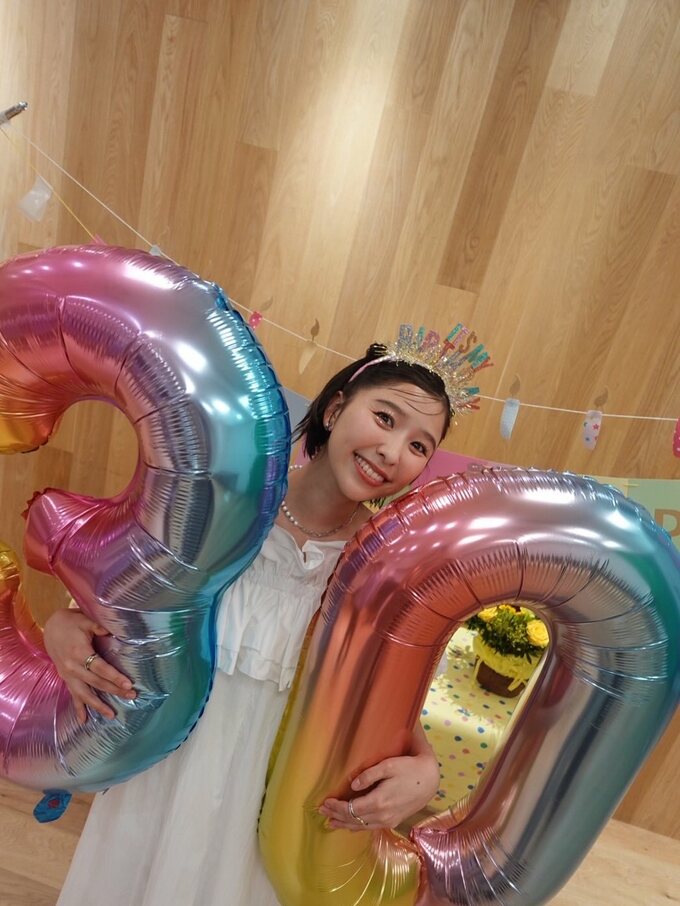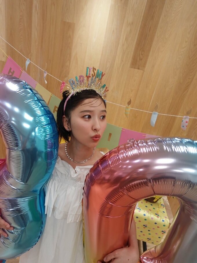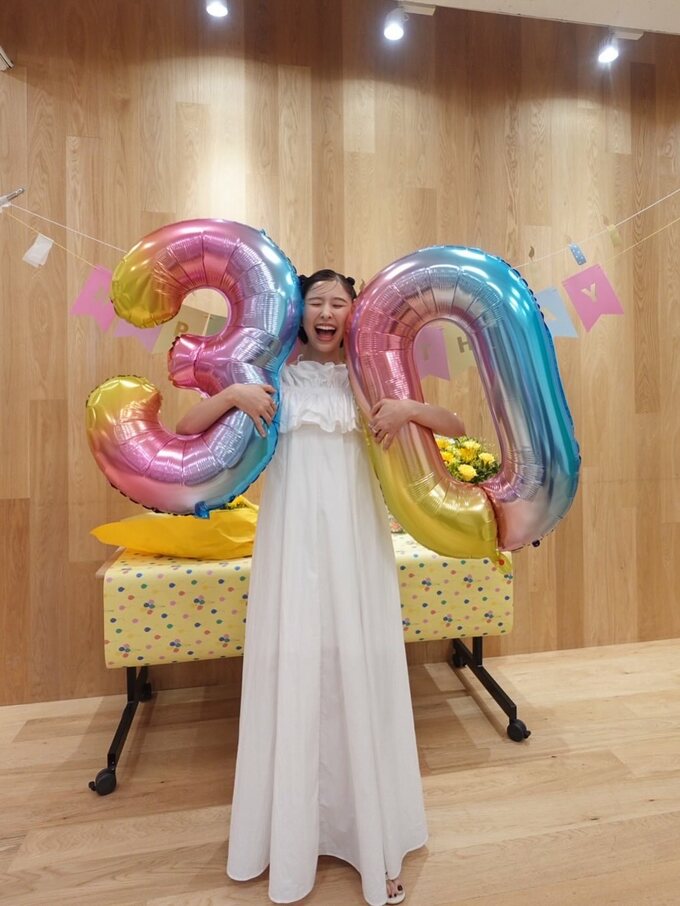 玉井さんは、胸元をドレープにして肩とデコルテを出したノースリーブの白のワンピースドレスを着て、ヘアを気持ち後ろめに流しつつ「IT’S MY BIRTHDAY」と文字を型取ったモール付きのカチューシャをかぶり、「3」「0」のバルーンをかかえたりしながら、喜びに大はしゃぎの様子を投稿しています。