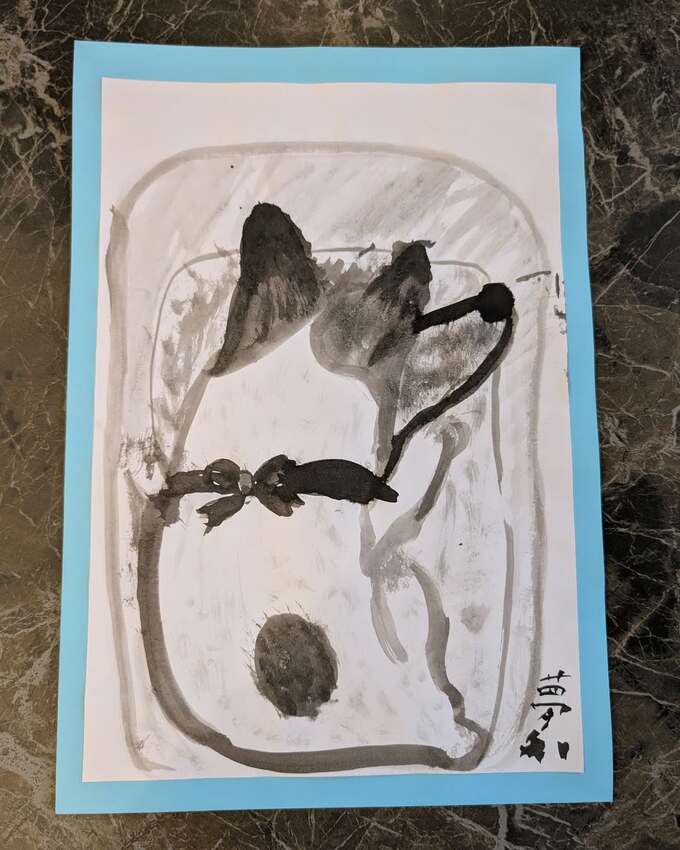 照英さんが投稿した写真には、黒の絵の具や灰色の絵の具で描かれたと思われる、犬の絵が描かれています。大きく立った三角形の耳と、その向こうにとがって飛び出ている鼻には濃く色が乗せられ、首のあたりには大きなリボンが結ばれています。