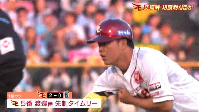 試合が動いたのは1回、ランナー1、3塁のチャンスで5番・渡邊佳明(わたなべよしあき)選手が5試合ぶりのスタメン起用に応えるタイムリー2ベースを打ち、2点を先制します。