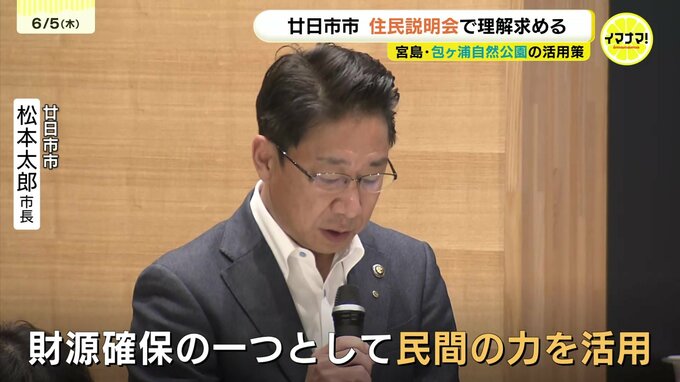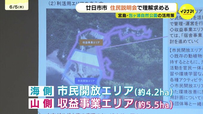 説明会には宮島の住民など100人余りが参加しました。廿日市市は、「包ヶ浦自然公園」に高級ホテルの誘致を検討していましたが、地元の意見などを踏まえ計画案を変更しました。市有地10ヘクタールのうち海側を「市民開放エリア」、そして山側を「収益事業エリア」として民間から事業者を公募するとしています。