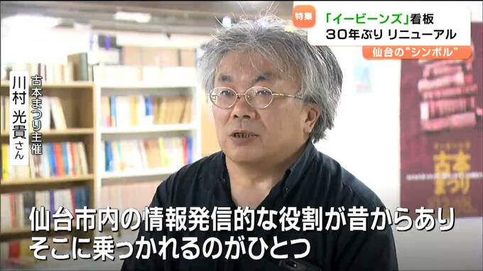 JR仙台駅前にある商業ビル「イービーンズ」の看板がおよそ30年ぶりにリニューアルされることになり、5月から撤去作業が行われています。