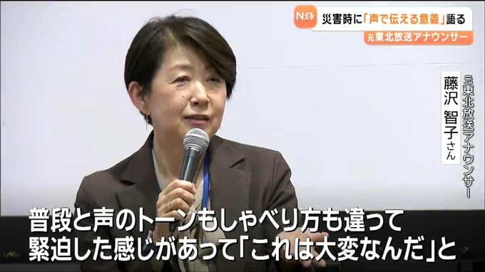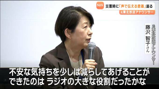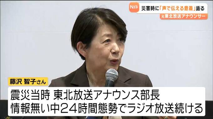 2011年の東日本大震災発生時、東北放送のアナウンス部長だった藤沢智子さんは、発災後、情報がない中、24時間態勢で放送を続けた当時の過酷な状況を語りました。