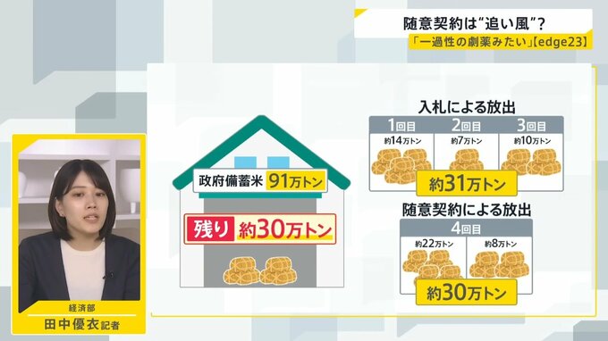 小泉大臣が打ち出した随意契約による備蓄米放出策によってコメ価格は下がりつつあるが、この政策をめぐって農水省内では「祭りの後」を懸念する声も上がっている。政府の備蓄米はもともと91万トンあり、江藤前大臣の時代に競争入札で約31万トンが放出され、小泉大臣就任後は随意契約で約30万トンが放出されることになった。残りは約30万トンで、今後の扱いが焦点となる。