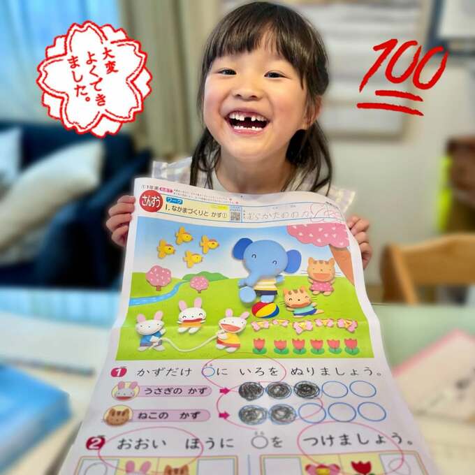 アカウントでは、「初めてのテストがかわいい」とコメントし、今年4月に小学1年生になったののちゃんが、初めてのテストで100点満点をとったことを報告しました。