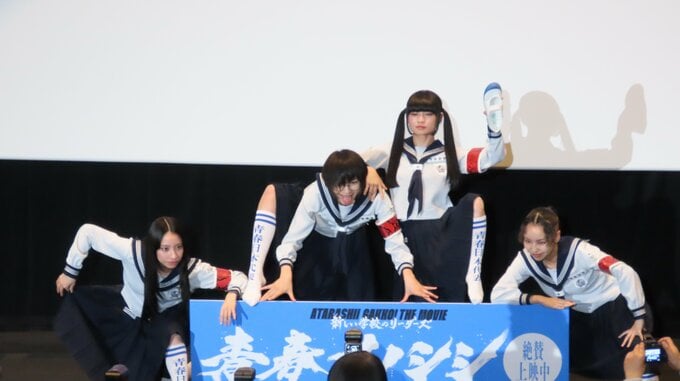 「新しい学校のリーダーズ」のライブ&ドキュメンタリー映画『青春イノシシ ATARASHII GAKKO! THE MOVIE』の公開初日舞台挨拶にKANONさん、SUZUKAさん、RINさん、MIZYUさんが登壇しました。