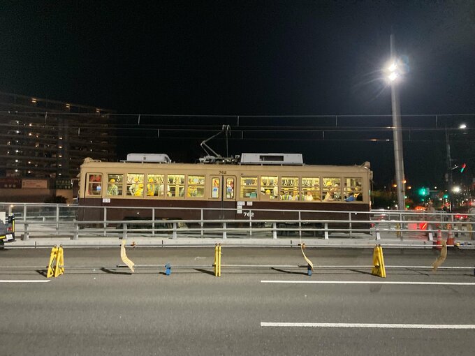 「駅前大橋線」の高架部分は、駅前通りから猿候川を越えて、広島駅の駅ビル2階部分に乗り入れるまでの約260メートルの区間です。試運転で高架部分に進むと、現場の作業員から拍手が上がりました。