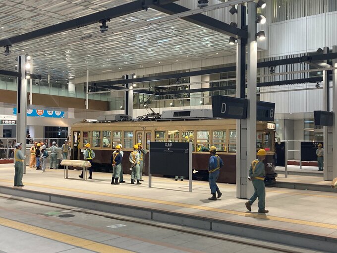 試運転で、路面電車が広島駅のホームに到着すると、広島電鉄の関係者や、偶然居合わせた人たちから大きな拍手が起こりました。