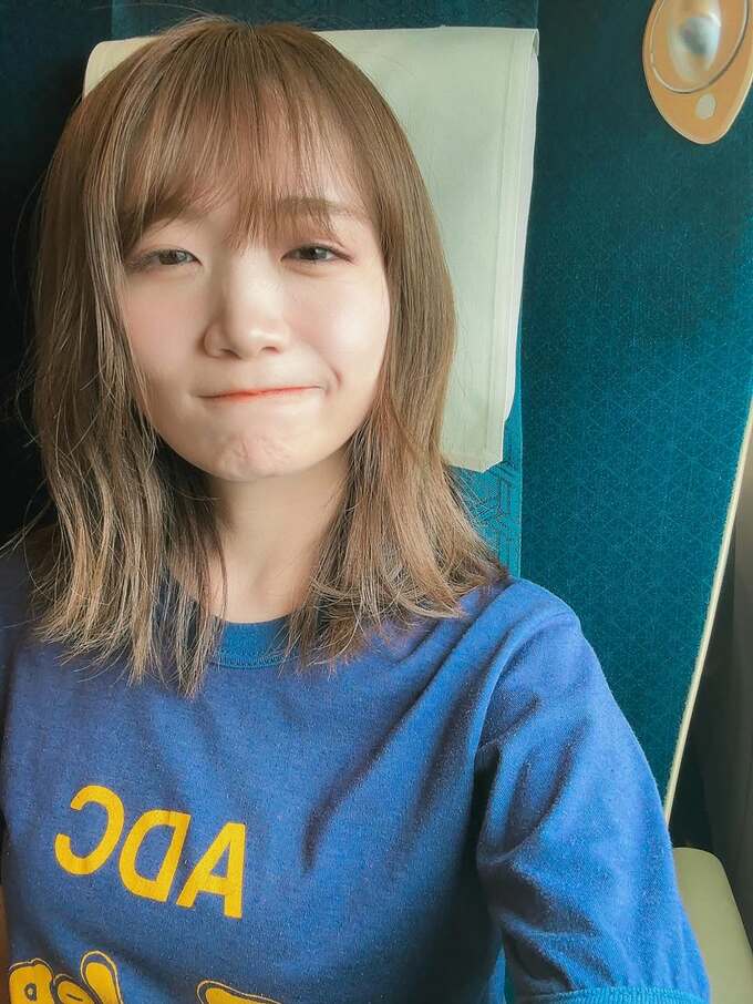 秋元さんは「お気に入りのTシャツ」「#古着」とだけテキスト。列車か高速バスのシートと思われるところに座り、窓からの光が髪と肌を明るく照らす中、薄めのメイクでにやりと微笑んでいる秋元さんは、和みある “この感じ” にご満悦の様子。