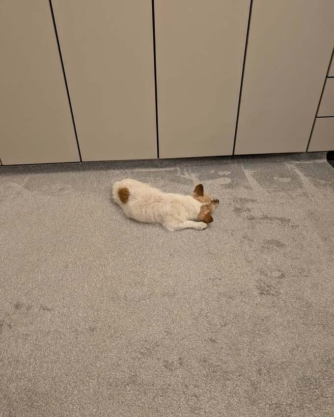 照英さんは「愛犬テン19歳8ヶ月!」といつもの調子でテキスト。投稿されている写真では、テンが広いカーペットの上でうつぶせになって顎を床面に置き、ぺたんと身体を伸ばして昼寝をしているように見えます。