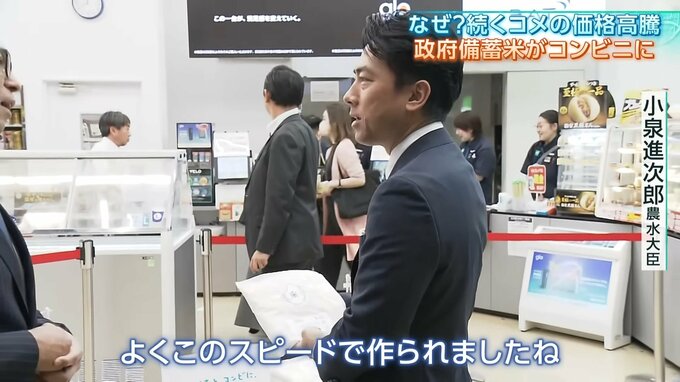 カメラの前で感心して見せたのは、小泉農林水産大臣。5日に視察したのは、コンビニに並んだ備蓄米です。そしてアピールしたのは…