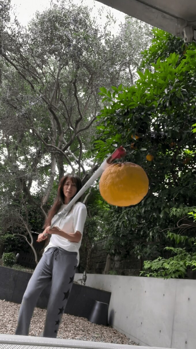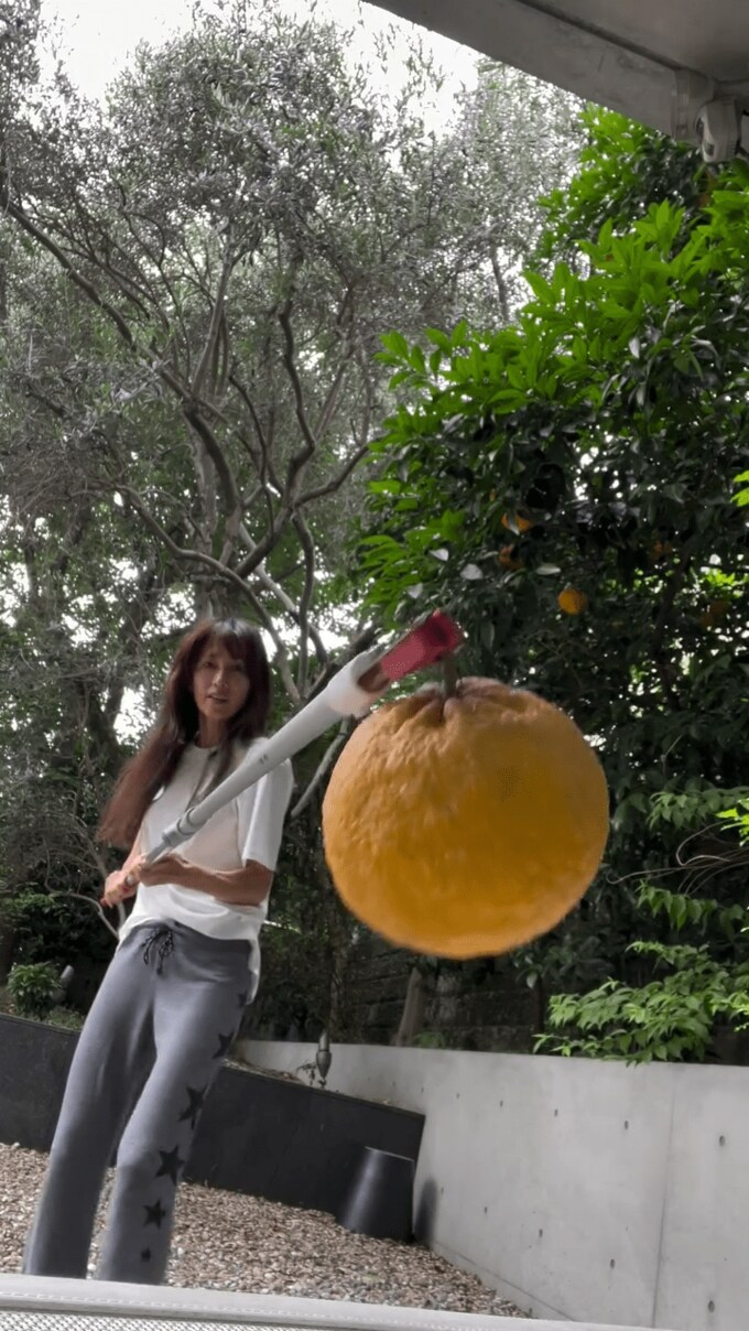 投稿された動画では、工藤静香さんが、高枝切りバサミを使って庭の木からオレンジを収穫するところから始まり、オレンジを洗って皮をむいてカットし、オレンジピールやゼリーを作成していく様子が見て取れます。