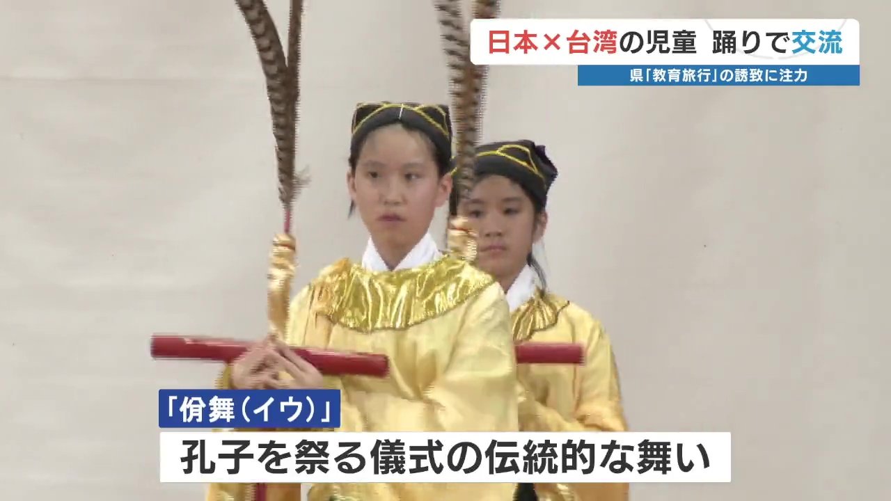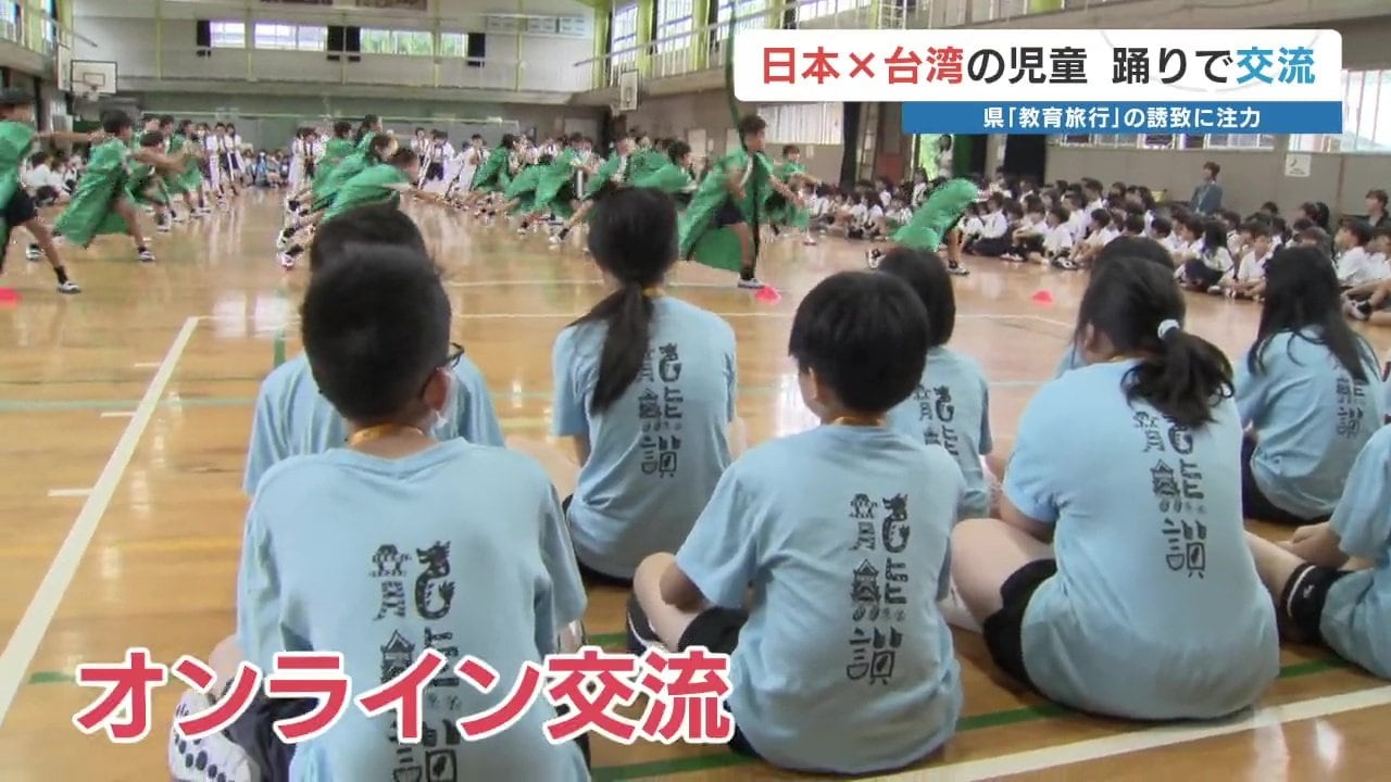 これは、台湾からの教育旅行の誘致に力を入れる熊本県の取り組みで実現したもので、台湾の児童たちは「イウ」と呼ばれる、孔子を祭る儀式の伝統的な舞いを披露し、熊本市の児童たちはソーラン節を披露し、交流を深めました。