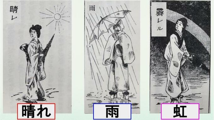 1888年(明治21年)、福沢諭吉が創刊した新聞「時事新報」に日本で初めてイラスト入りの天気予報が掲載されました。そのイラストをよく見ると、晴れでも閉じた傘を持ち、雨では傘を広げ、雨のち晴れというイラストには虹と傘を持った女性が描かれているのがわかります。