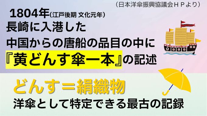 日本洋傘振興協議会によると長崎に入港した中国の唐船の品目に「黄どんす傘一本」という記述があったそうです。「どんす」とは絹織物のこと。つまり日本初の洋傘は「黄色い絹織物の傘」だったと考えられます。