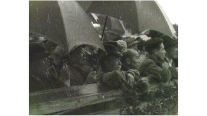 TBSのアーカイブスに残る傘の一番古い映像は1948年。雨の中、傘をさして競馬を見物する人々が映し出されています。当時「コウモリ」と呼ばれていた黒くて大きい傘をさしている様子が確認できます。