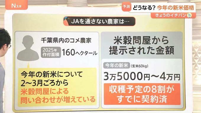 2025年の作付面積は160ヘクタールだという千葉県内のコメ農家は「今年の新米について、2月から3月ごろから、米穀問屋による問い合わせが増えている」と話していました。