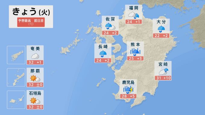 【大雨情報】梅雨前線がかかり10日(火)は九州北部で引き続き大雨に 福岡県、佐賀県、長崎県、大分県、熊本県で「線状降水帯」発生のおそれ 24時間予想雨量は180ミリに 雨と風シミュレーション 北陸放送 2025年6月10日(火) 09:33 国内 10日は西日本から東日本にかけて雨が降る見込みです。雨が降り続いている九州ではとくに地盤が緩んでいる可能性があります。 九州北部では、10日夕方にかけて低い土地の浸水や川の増水・氾濫に、11日昼前にかけて土砂災害に厳重に警戒をしてください。